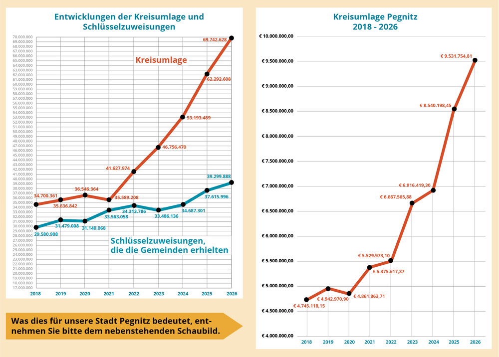 Die Schlüsselzuweisungen des Freistaats lagen 2021 bei rund 33,6 Millionen Euro und deckten nahezu die Kreisumlage. 2026 erhalten die Gemeinden etwa 39,3 Millionen Euro – müssen aber rund 30 Millionen Euro mehr an den Landkreis abführen als noch 2021. Das bedeutet: Trotz höherer Zuweisungen bleibt unter dem Strich deutlich weniger Handlungsspielraum.